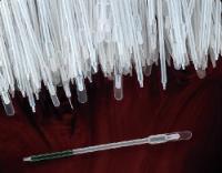 Disposable Transfer Pipets, Polyethylene^ Drop Size: 30ul. Capacity: 1.0ml. Bulb Draw: 0.2ml. Total Length: 13.1cm. Stem Diameter: 3.8mm. Useful for delivering drops onto slides or tiles. The paddle end can then be used to spread or mix reagents.