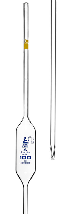 Eisco Labs 100mL Volumetric Pipette, Borosilicate glass, Class A with /-0.080 tolerance as per DIN ISO 648 standard. Calibrated for delivery. With blue graduation/markings and yellow color code for easy volume identification. Individually wrapped. Length: 23".