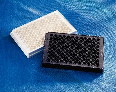 Costar* Brand 96-Well Solid Plates^ Flat bottom, opaque polystyrene plate with low fluorescent/luminescent background. Minimal well-to-well cross talk. A high binding surface ideal for immunoassay work. Black. Well volume: 0.36mL.