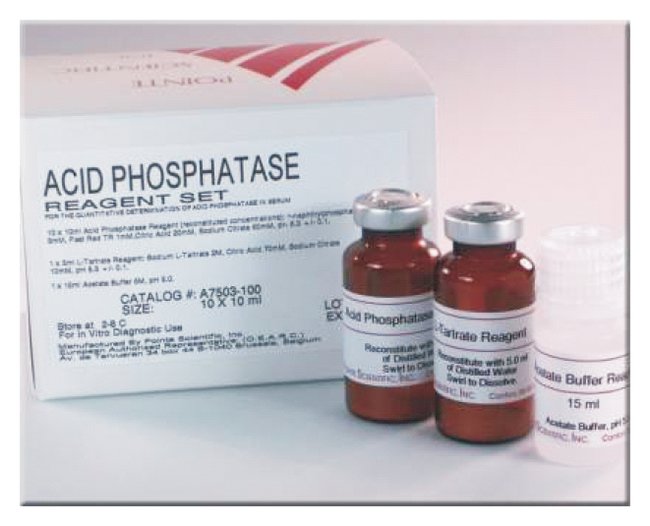 Reagent Set 1 includes Acid Phosphatase Reagent (10 x 10mL), L-Tartrate Reagent (5mL), and Acetate Buffer (15mL). Reagent Kit HA703-60 is used with Hitachi 704, 717.