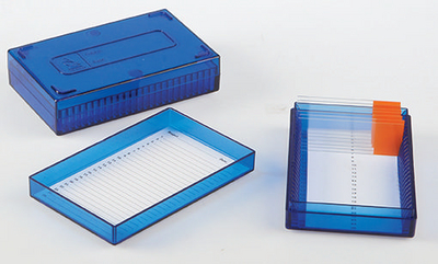 Slide box^ Polycarbonate slide box-25 place, protects slides to -80 celcius. Made out of durable polycarbonate and stainless steel clamp, slots separate slides preventing slde contact. Temperature resistent numbered foam lining and identification sheet st