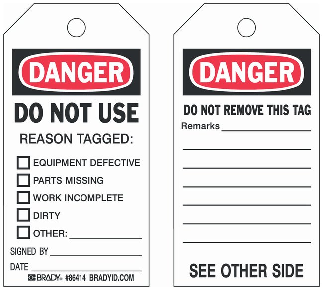 Identify facility equipment to your exact specifications. The Brady™ Accident Prevention Tagsare durable two-sided tags with a write-on area that accepts most marking pens.
