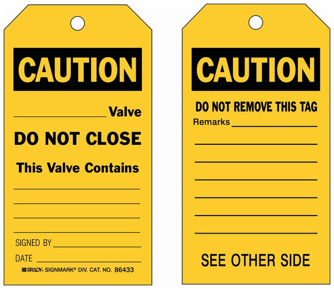 Identify facility equipment to your exact specifications. The Brady™ Polyester Encased Paper Tag: CAUTION are durable two-sided tags with a write-on area that accepts most marking pens.