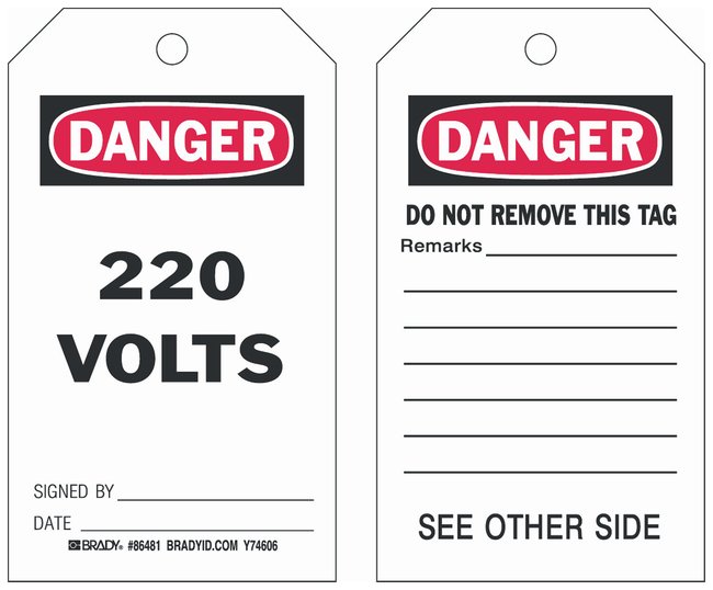Polyester Encased Paper Tag: DANGER 220 VOLTS SIGNED BY: DATE:, Pack of 10