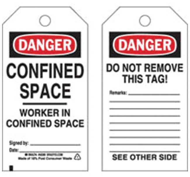 Polyester Encased Paper Tag: DANGER CONFINED SPACE WORKER IN CONFINED SPACE Signed By: Date:, Pack of 25