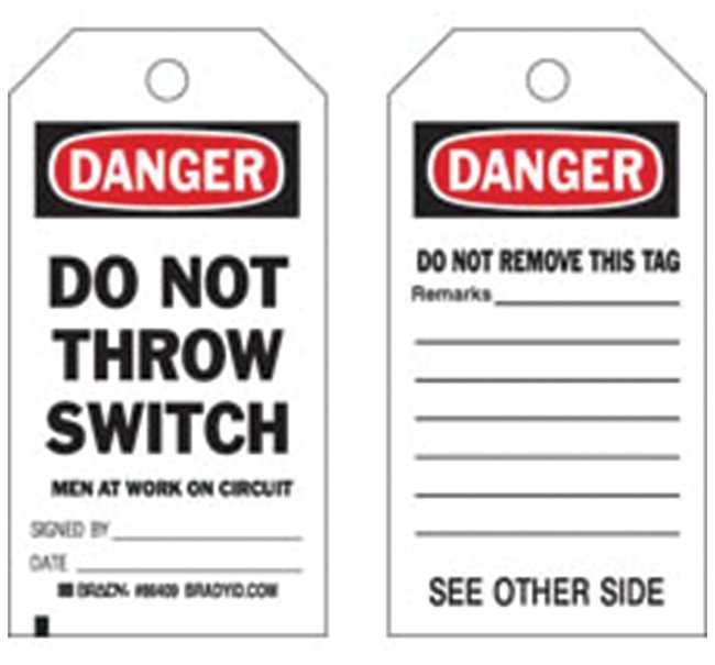 Polyester Encased Paper Tag: DANGER DO NOT THROW SWITCH MEN AT WORK ON CIRCUIT SIGNED BY: DATE:, Pack of 10