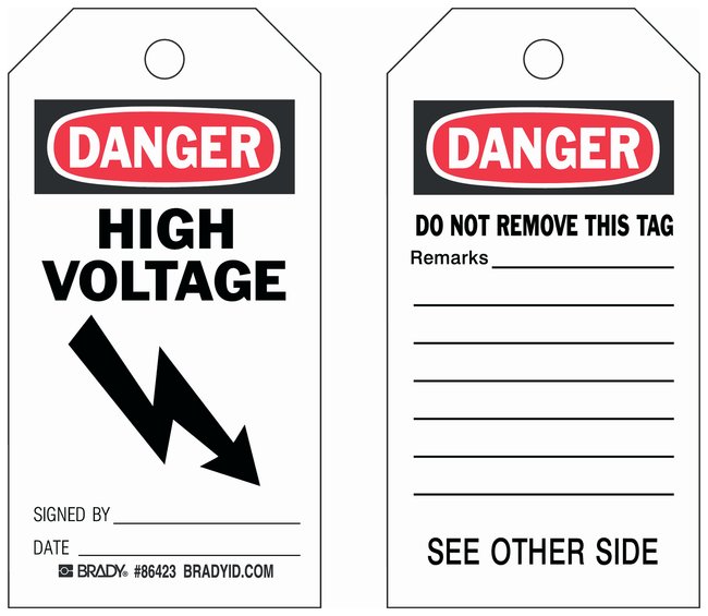 Polyester Encased Paper Tag: DANGER HIGH VOLTAGE SIGNED BY: DATE:, Pack of 10