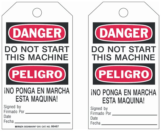 Polyester Encased Paper Tag: DANGER/PELIGRO DO NOT START THIS MACHINE INO PONGA EN MARCHA ESTA MAQUINA! SIGNED BY FIRMADO POR: DATE FECHA:, Pack of 10