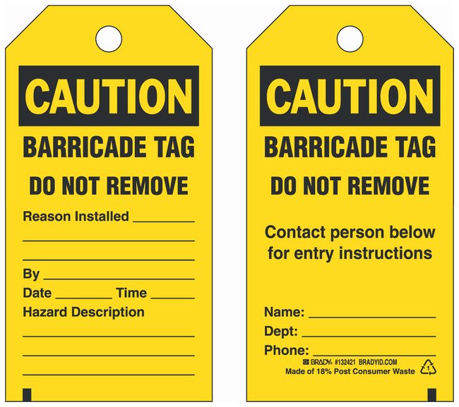 Polyester Tag: CAUTION BARRICADE TAG DO NOT REMOVE REASON INSTALLED: BY: DATE: TIME: HAZARD DESCRIPTION:, Pack of 25