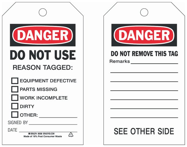 Polyester Tag: DANGER DO NOT USE REASON TAGGED: *EQUIPMENT DEFECTIVE *PARTS MISSING *WORK INCOMPLETE *DIRTY *OTHER SIGNED BY: DATE:, Pack of 10