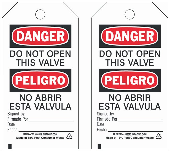 Polyester Tag: DANGER/PELIGRO DO NOT OPEN THIS VALVE NO ABRIR ESTA VALVULA SIGNED BY FIRMADO POR: DATE FECHA:, Pack of 10
