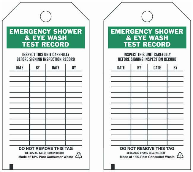 Identify facility equipment to your exact specifications. Brady™ Polyester Tags EMERGENCY SHOWER & EYEWASH TEST RECORD are durable two-sided tags with a write-on area that accepts most marking pens.