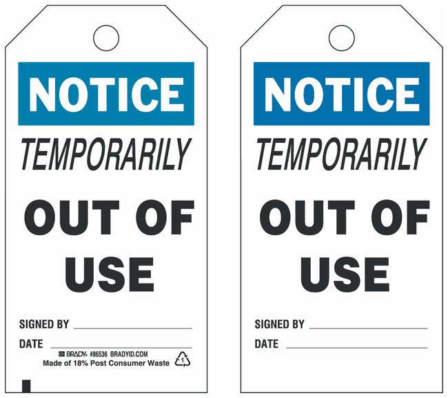 Polyester Tag: NOTICE TEMPORARILY OUT OF USE SIGNED BY: DATE:, Pack of 10