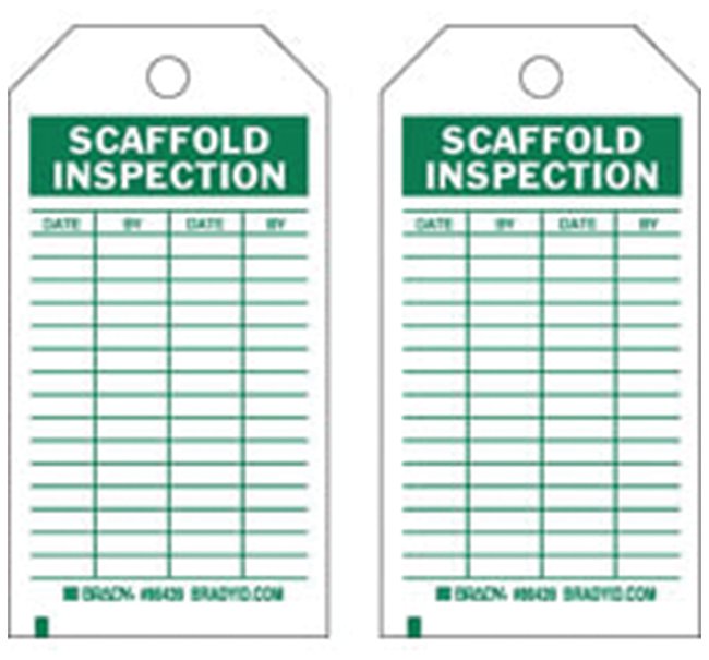 Identify facility equipment to your exact specifications. Brady™ Polyester Tags SCAFFOLD INSPECTION are durable two-sided tags with a write-on area that accepts most marking pens.