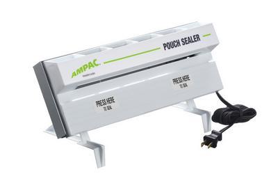 Pouch Sealer^ Seal and compartmentalize heat-sealable pouches. 120V. Aluminum rear panel. Fluoropolymer-resin coated sealing bar. 26 L x 1.6 W cm. One-year warranty. White. Includes 2 detachable legs, mounting tabs, leg pads, and 168cm long cord. Not for use with plastic/polyethylene bags. UL.