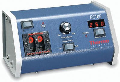 Power Supply, 250V, E-C Apparatus^ Input: 220VAC. Maximum current: 300mA between 150-250V; 500mA below 150V. Voltage steps: 20-130V, 10V steps; 140-250V, 110V steps. Dimensions: 20.3Wx13.3Dx11.4Hcm. Ideal for submarine gel electrophoresis. Suitable for Mini-SDS-PAGE. Dual output, digital readout.