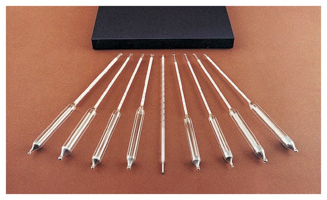 Precision Specific Gravity Hydrometers, This set includes a thermometer with 0° to 220°F range and eight precision hydrometers, Each
