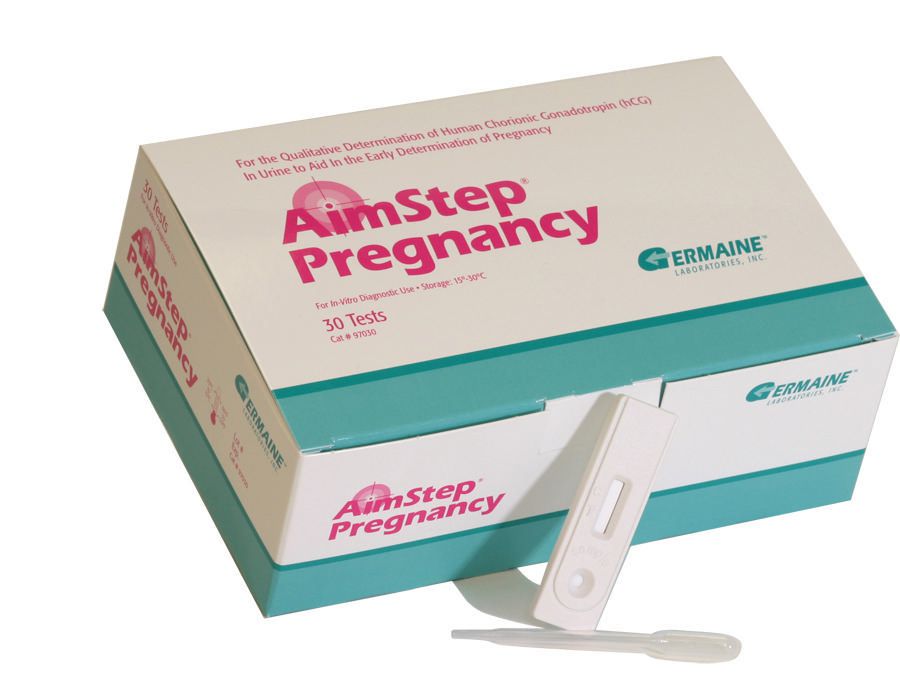 Pregnancy test^ AimStep* Pregnancy, Urine cassette test for professional use, For the rapid qualitative determination of human Chorionic Gonadotropin (hCG) in urine, Sensitive to 20mIU/mL of hCG, Cassette test with pipette prepackaged in foil pouch, Size: 30 tests per box