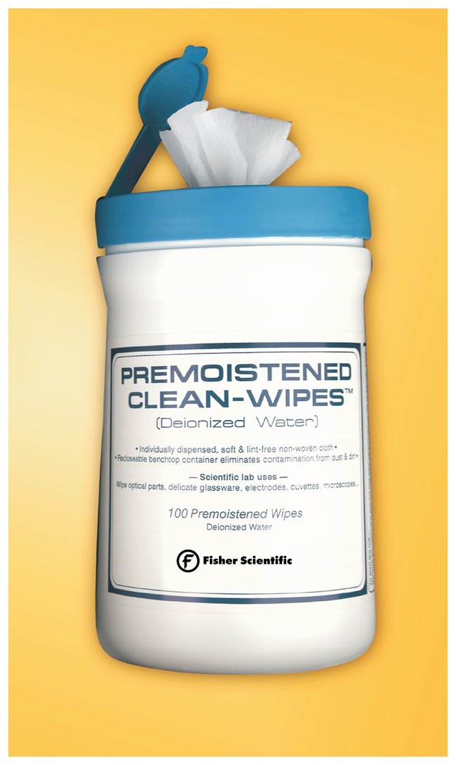 Fisherbrand™ Clean-Wipes™ are ideal for cleaning or wiping optical parts, glassware, electrodes, cuvettes and microscopes.Cellulose and polyester blend cloth is soft and lint-free; will not scratch surfaces or fall apart like paper wipesReclosable container dispenses single wipes, eliminates contamination from dust and dirtPremoistened with 100% pure deionized water