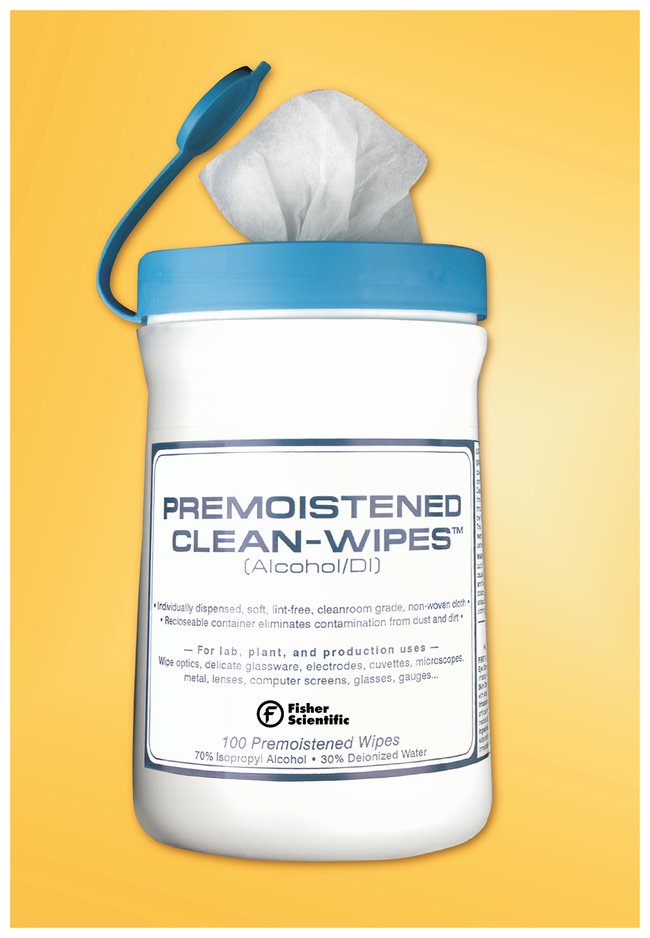 Fisherbrand™ Clean-Wipes™ are ideal for cleaning or wiping optical parts, glassware, electrodes, cuvettes and microscopes.Cellulose and polyester blend cloth is soft and lint-free; will not scratch surfaces or fall apart like paper wipesReclosable container dispenses single wipes, eliminates contamination from dust and dirtPremoistened with a blend of pure reagent-grade 70% isopropyl alcohol and 30% deionized water