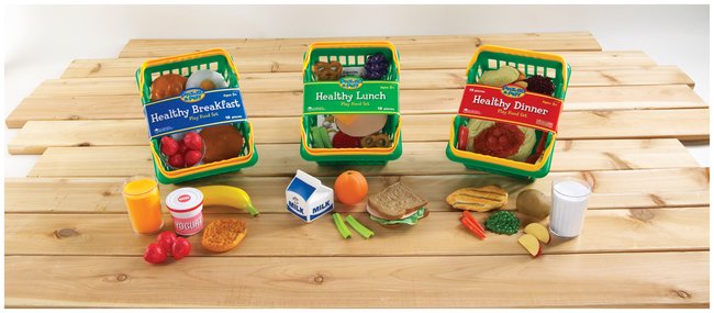 Great for developing oral language through role play in early childhood and ELL classroomsAll pieces are actual size and washableBreakfast set includes an English muffin half, egg, banana, seven strawberries in a bowl, two pancakes, butter, yogurt cup, and orange juiceLunch set includes two slices of wheat bread, two slices of turkey, lettuce, tomato, cheese, four celery sticks, two pretzels, grapes, orange, and milkDinner set includes grilled chicken breast, spaghetti with tomato sauce, peas, beans, potato, four apple slices, five carrot sticks, French bread, and milkOrder InfoGrades PK-K