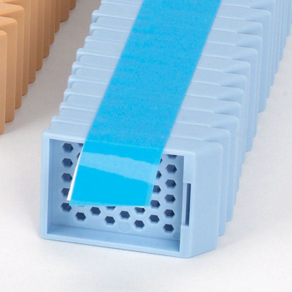 Cassette^ Cassettes in taped Stack, Tissue Embedding, without Lid, 45deg Writing Area, blue, 35deg angled, Large thumb tab on the front for easy opening, The lid stays attached for repeated opening and closing, Two side panels ideal for labeling.