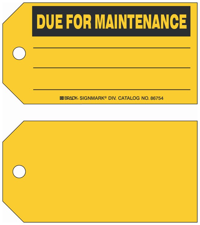 Identify facility equipment to your exact specifications. Brady™ Production Status Tags: DUE FOR MAINTENANCE are durable one-sided tags that are an economical and convenient way to ID equipment.