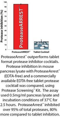 PROTEASE INHIBITOR COCKTAIL^ EDTA free. Inhibits a wide variety of protease classes, including serine and cytokine proteases. Greater than 90% inhibition of mouse pancreas lysates. Will not interfere with metal affinity chromatography. Each vial will make 50ml of 1x solution. Pack of 20 vials.