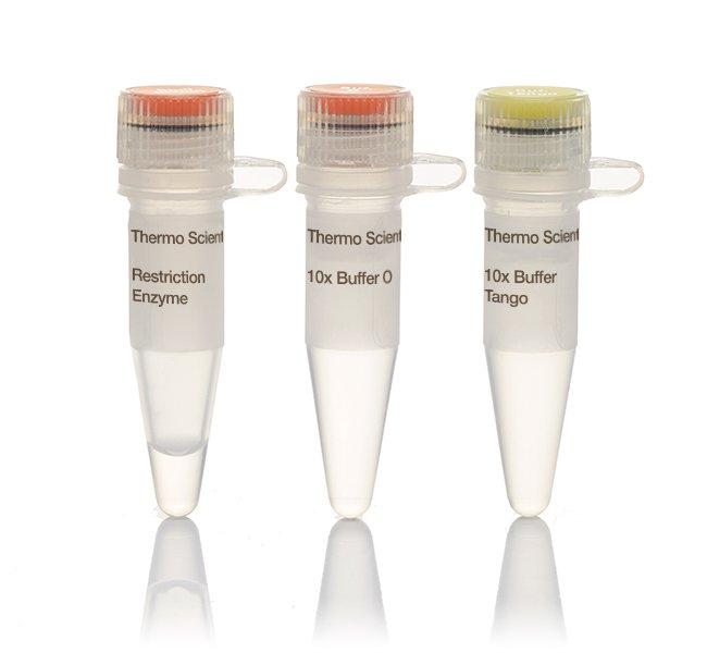 Lambda DNA digested with PstI, 0.7% agarose, 28 cleavage sitesconventional restriction endonucleases are a large collection of high quality restriction enzymes, optimized to work in one of the buffers of the Five Buffer System. In addition, the universal Tango buffer is provided for convenience in double digestions. All of the enzymes exhibit 100% activity in the recommended buffer and reaction conditions. To ensure consistent performance, Thermo Scientific restriction enzyme reaction buffers contain premixed BSA, which enhances the stability of many enzymes and binds contaminants that may be present in DNA preparations.5' C T G C A ↓G 3' 3' G ↑A C G T C 5' Thermo Scientific PstI restriction enzyme recognizes CTGCA^G sites and cuts best at 37°C in O buffer (Isoschizomers: BspMAI). See Reaction Conditions for Restriction Enzymes for a table of enzyme activity, conditions for double digestion, and heat inactivation for this and other restriction enzymes. Note: Also available as a FastDigest enzyme for rapid DNA digestion. In addition, the universal Tango buffer is provided for convenience in double digestions. All of the enzymes exhibit 100% activity in the recommended buffer and reaction conditions. To ensure consistent performance, Thermo Scientific restriction enzyme reaction buffers contain premixed BSA, which enhances the stability of many enzymes and binds contaminants that may be present in DNA preparations.Features• Superior quality—stringent quality control and industry leading manufacturing process• Convenient color-coded Five Buffer System• Includes universal Tango buffer for double-digestions• BSA premixed in reaction buffers• Wide selection of restriction endonuclease specificitiesApplications• Molecular cloning• Restriction site mapping• Genotyping• Southern blotting• Restriction fragment length polymorphism (RFLP)• SNPNote: For methylation sensitivity, refer to product specifications.