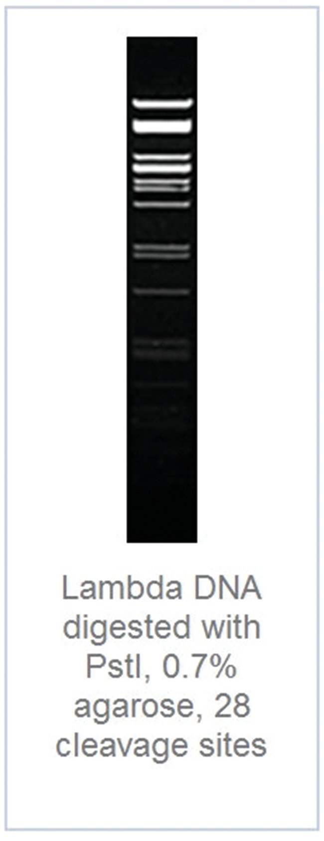 Lambda DNA digested with PstI, 0.7% agarose, 28 cleavage sitesconventional restriction endonucleases are a large collection of high quality restriction enzymes, optimized to work in one of the buffers of the Five Buffer System. In addition, the universal Tango buffer is provided for convenience in double digestions. All of the enzymes exhibit 100% activity in the recommended buffer and reaction conditions. To ensure consistent performance, Thermo Scientific restriction enzyme reaction buffers contain premixed BSA, which enhances the stability of many enzymes and binds contaminants that may be present in DNA preparations.HighlightsSuperior quality -stringent quality control and industry leading manufacturing processConvenient color-coded Five Buffer SystemIncludes universal Tango buffer for double-digestionsBSA premixed in reaction buffersWide selection of restriction endonuclease specificitie