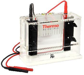 Puffin* Single-Sided Vertical Minigel System^ Without cooling core. Gel size: 10Wx10Lcm. Dimensions: 18.4Wx12.7Hx8.3Dcm. Buffer volume: 150mL. Extended upper buffer chamber puts buffer in direct contact with entire gel surface. Built-in, full length, spring-loaded side clamps provide leakproof seal.