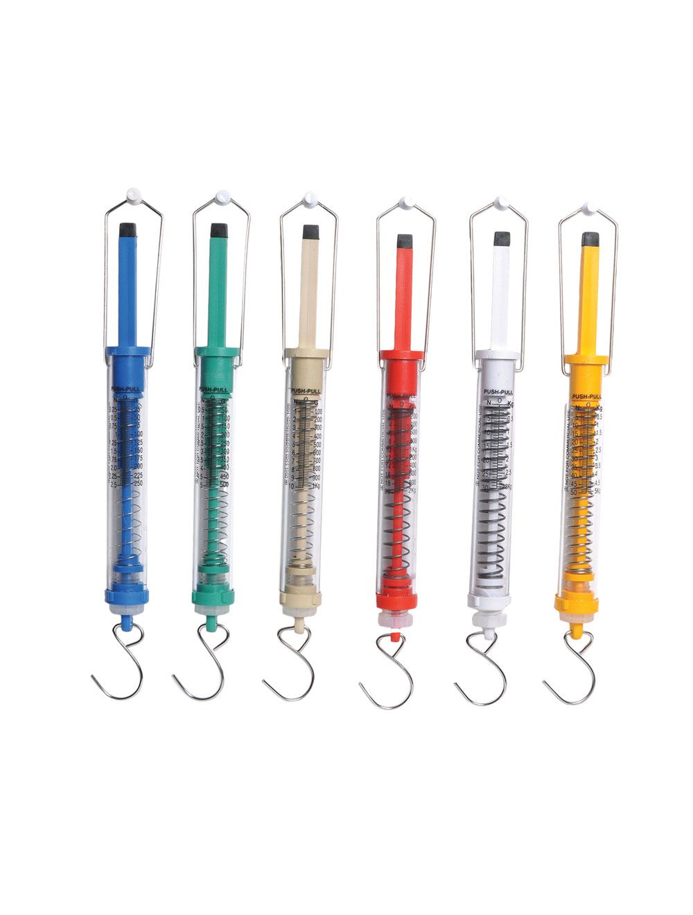 This uniquely designed spring scale (dynamometer) features a clear tube, making the inner workings visible.The elongation of the spring corresponds to a specific force, which is noted on the printed scale. Different spring scales have different spring qualities to reflect the desired maximum load. These color-coded spring scales feature both a gram and Newton scale. Unlike other spring scales, the plunger on the one end allows pushing forces to be measure as well as pulling forces. Additionally, the spring scale can be pulled back to adesired force and then released, imparting a known force to a projectile. The long top loop and the large S hook are both made from durable steel. The top plastic zero adjustment nut is easy to use. The durable acrylic tube and sturdy spring is built to last with repeated use. Overall length is 11†and diameter is 1â€. Available in a variety of weight capacities and color coded for each reference. Great for physics demonstrations and experiments.
