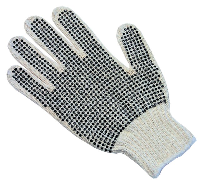 Cotton string knit gloves with PVC dots on either one side or both sidesIdeal for protecting hands from dirt and abrasionSeamless construction is comfortable and reversibleAvailable in universal women's and men's sizesColor-coded hem for quick size identificationStandard weightLaunderable