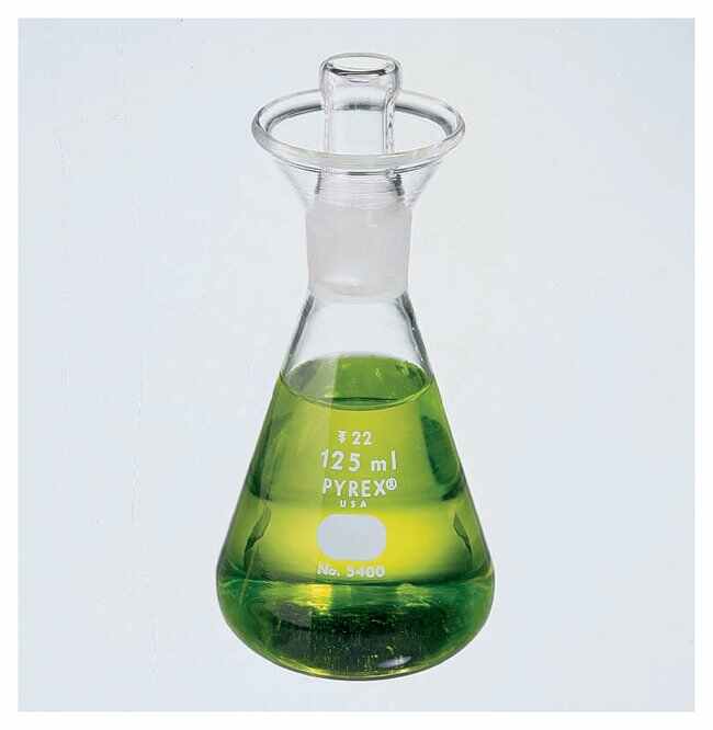 These iodine determination flasks are blown in specially designed molds, thereby insuring uniformity and proper contour. The stopper projects above the liquid seal trough to facilitate removal.Reference: ASTM D-29 and D-555. For stopper only, see Cat. No. 7640N.ComplianceASTM™ D 29 and D 555