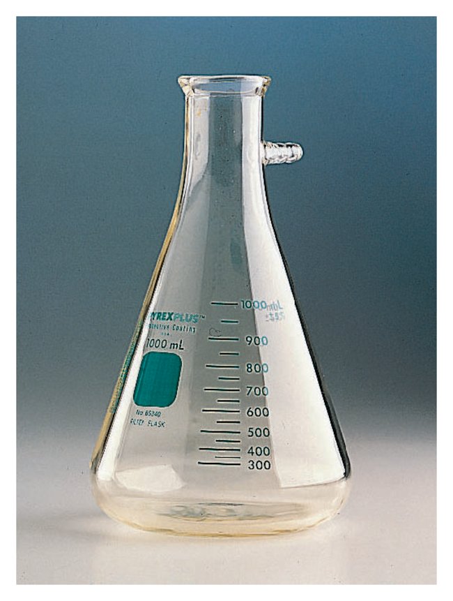 Coated Heavy Wall Filtering Flasks with Sidearm Tubulation, Pyrex borosilicate glass with PVC coating reduces chance of breakage, Each