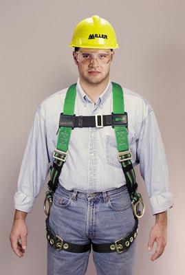 PYTHON HARNESS GREEN TONGUE^ Miller DuraFlex Python* Harness with Python webbing*, side d-rings, tongue buckle legs, Santoprene* D-ring back pad, pull-free lanyard rings, and belt loops