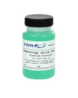 Brand: VWR® Quick III™, MDL: MFCD00132593, VWR® brand hematology stain offerings satify the needs of laboratory professionals following manual, rapid stain or automated protocols., Single-step stains are offered in Wright's and Wright Giemsa formulations and use deionized water to complete the staining process. Three step stain offering yields results comparable to Wright Giemsa stain with results available as soon as 15 seconds., 02_BulletPoint: Stain offerings for multiple protocols | Individual stains, reagents and packs have been used in the automated market on the Hematek®, Midas®, Sysmex® and Sakura® instruments, 08_Certifications: Hematology stain products are manufactured using dyes certified by the Biological Stain Commission. All products undergo Quality Control evaluation using fresh blood., Size: 3×90 ml (3×3 oz.), Final SAP Desc Link: 2992793, SAP Description Status: Ready, 001_test: Quick III Solution I Absorbance, 001_result: 300-340MA @~518nm, 002_test: Quick III Solution I pH, 002_result: 6.55-6.65@25°C, 003_test: Quick III Solution II Absorbance, 003_result: 440-460MN@~650nm, 004_test: Quick III Solution II pH, 004_result: 6.85-6.95@25°C, 005_test: Quick III Fixative, 005_result: Physical Inspection, DESC_CALC_test_BP: Wright-Giemsa stain, VWR® Quick III™ Set for hematology, Storage temperature_value: Ambient, Cat. No.: 10143-224, Brand: VWR® Quick III™, Grade/Usage: Staining | Dye & Stain | Haematology, MDL: MFCD00132593, VWR® brand hematology stain offerings satify the needs of laboratory professionals following manual, rapid stain or automated protocols., Single-step stains are offered in Wright's and Wright Giemsa formulations and use deionized water to complete the staining process. Three step stain offering yields results comparable to Wright Giemsa stain with results available as soon as 15 seconds., 02_BulletPoint: Stain offerings for multiple protocols | Individual stains, reagents and packs have been used in the automated market on the Hematek®, Midas®, Sysmex® and Sakura® instruments, 08_Certifications: Hematology stain products are manufactured using dyes certified by the Biological Stain Commission. All products undergo Quality Control evaluation using fresh blood., Final SAP Desc Link: 2992793, SAP Description Status: Ready, 001_test: Quick III Solution I Absorbance, 001_result: 300-340MA @~518nm, 002_test: Quick III Solution I pH, 002_result: 6.55-6.65@25°C, 003_test: Quick III Solution II Absorbance, 003_result: 440-460MN@~650nm, 004_test: Quick III Solution II pH, 004_result: 6.85-6.95@25°C, 005_test: Quick III Fixative, 005_result: Physical Inspection, DESC_CALC_test_BP: Wright-Giemsa stain, VWR® Quick III™ Set for hematology, Storage temperature_value: Ambient