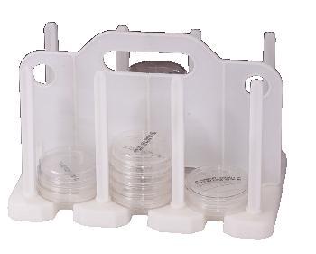 Rack^ For transport and incubation of up to 60 contact plates with lids (RODAC*, Becton Dickinson). Four racks can be stacked together. A center divider has a handle and space for labeling. All parts are steam autoclavable white polypropylene. Racks are shipped flat, easy to assemble.