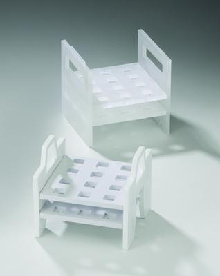 These two-tier racks support cuvettes with minimal physical contact, greatly reducing the chance of damage. Only the corners of the cuvettes touch the racks, minimizing the risk of contamination or damage. • Racks accommodate 12 cuvettes with a 10 mm light path. • Racks will not scratch quartz cuvettes. • Rack 58020-105 features Stack Rack Interlocking end plates for secure stacking. • Manufactured from polypropylene, these racks are steam autoclavable at 121°C (250°F). The Non-Stackable Rack (Cat. No.: 58020-104) measures 11.7 x 10.8 x 11.1 cm (4.5/8 x 4.1/4 x 4.3/8"). The Stackable Rack (Cat. No.: 58020-105) measures 11.4 x 11.1 x 11.1 cm (4.1/2 x 4.3/8 x 4.3/8).
