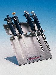 Pipettor Support Rack^ Freestanding stainless steel rack holds most popular brand pipettors, including the Gilson* Pipetman*. It has five positions, a sloping back and open front notches to hold the pipettors. Dimensions: 23Wx14.6Lx19.7Hcm.