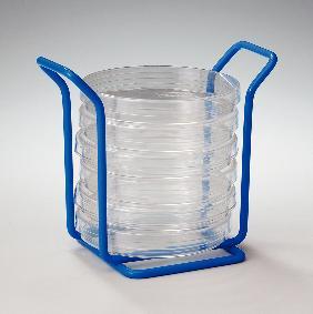 Petri Dish Mini Rack^ Helps keep benchtops neat and organized. Welded steel wire rack holds six 100mm petri dishes with lids. Ideal for lab transport and incubation of dishes. Durable blue epoxy coated racks are steam autoclavable at 121[degree]C. Overall dimensions are 13x8.5x12Hcm.