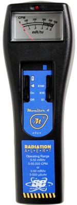 Pocket-Size Portable Radiation Alert* Monitor 4^ Internal GM detector, anti-saturation circuitry, and red count light. Detects alpha, beta, gamma, and x-rays with halogen-quenched GM tube. 1.5-2.0 mg/cm2 mica end window. Analog meter reads 0-0.5, 0-5, 0-50 mR/hour or 0-50,000 cpm. 3 settable ranges.