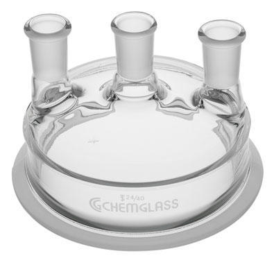 REACTION VESSEL LID, 3-NECK^ Joint size: Center Neck: 29/42; Side Necks: 24/40. Flange I.D; 100mm. Three neck vessel lid to fit CG-1920 through CG-1936 vessels. Lid has a flat ground surface to allowing it to be greased or used with an o-ring.