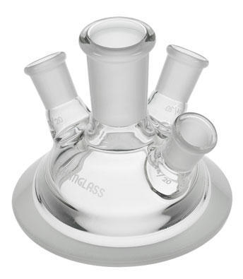 REACTION VESSEL LID, FOUR NECK^ Joint size: Center Neck: 24/40; Side Necks: 14/20. Flange I.D; 60mm. Four neck reaction vessel lid to fit CG-1930 through CG-1931 vessels. Side necks are on a 30[degree] angle. Lid has a flat ground surface allowing it to be greased or used with an o-ring.