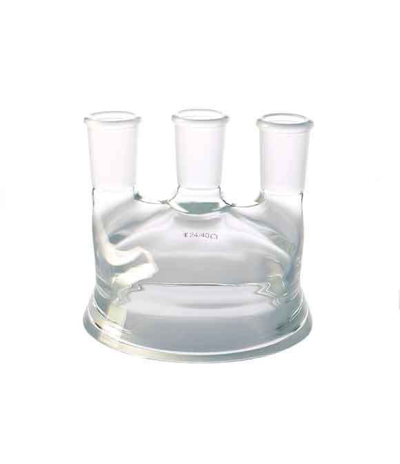 Three-neck flask top with a flat ground flange for use with cylindrical and spherical flasks having the same ID, Manufactured from 33 expansion, low extractable borosilicate glass conforming to USP Type I and ASTM E438, Type I, Class A requirements