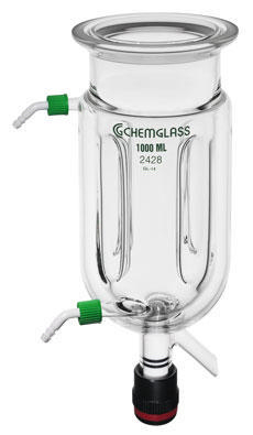 1L Reaction Vessel, Cylindrical, Jacketed, Morton^ Sidearm Lower Drain Valve, 100mm Schott O-Ring Flange, 97mm I.D. x 395mm Height. With Morton indentations to increase agitation during stirring. Inlcudes two polypropylene hose connections and two screw caps.