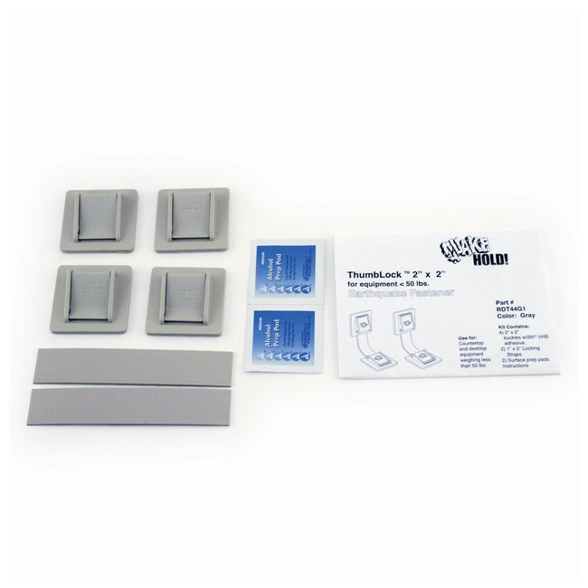 All kits come with instructions as well as two surface prep pads.Kit for equipment less than 25 lb.(11.3kg) contains: Four buckles with 3M™ VHB adhesive: 1 x 2 in. (2.54 x 5.1cm)Two locking straps: 0.75 x 4 in. (1.9 x 10.2cm)Kit for equipment less than 50 lb. (22.7kg) contains:Four buckles with 3M VHB adhesive: 2 x 2 in. (5.1 x 5.1cm)Two locking straps: 1 x 5 in. (2.54 x 12.7cm)Kit for equipment less than 200 lb. (90.7kg) contains:Four buckles with 3M VHB adhesive: 2 x 3 in. (5.1 x 7.6cm)Two locking straps with holes: 1 x 8 in. (2.54 x 20.3cm)