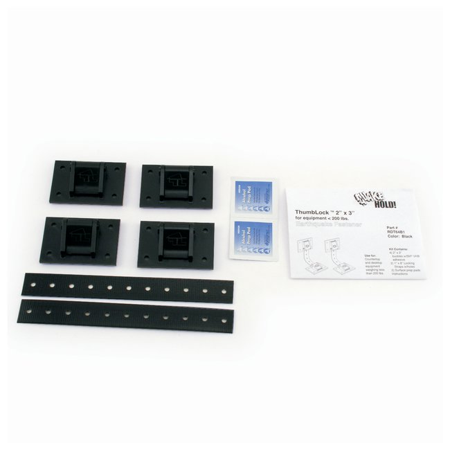 All kits come with instructions as well as two surface prep pads.Kit for equipment less than 25 lb.(11.3kg) contains: Four buckles with 3M™ VHB adhesive: 1 x 2 in. (2.54 x 5.1cm)Two locking straps: 0.75 x 4 in. (1.9 x 10.2cm)Kit for equipment less than 50 lb. (22.7kg) contains:Four buckles with 3M VHB adhesive: 2 x 2 in. (5.1 x 5.1cm)Two locking straps: 1 x 5 in. (2.54 x 12.7cm)Kit for equipment less than 200 lb. (90.7kg) contains:Four buckles with 3M VHB adhesive: 2 x 3 in. (5.1 x 7.6cm)Two locking straps with holes: 1 x 8 in. (2.54 x 20.3cm)