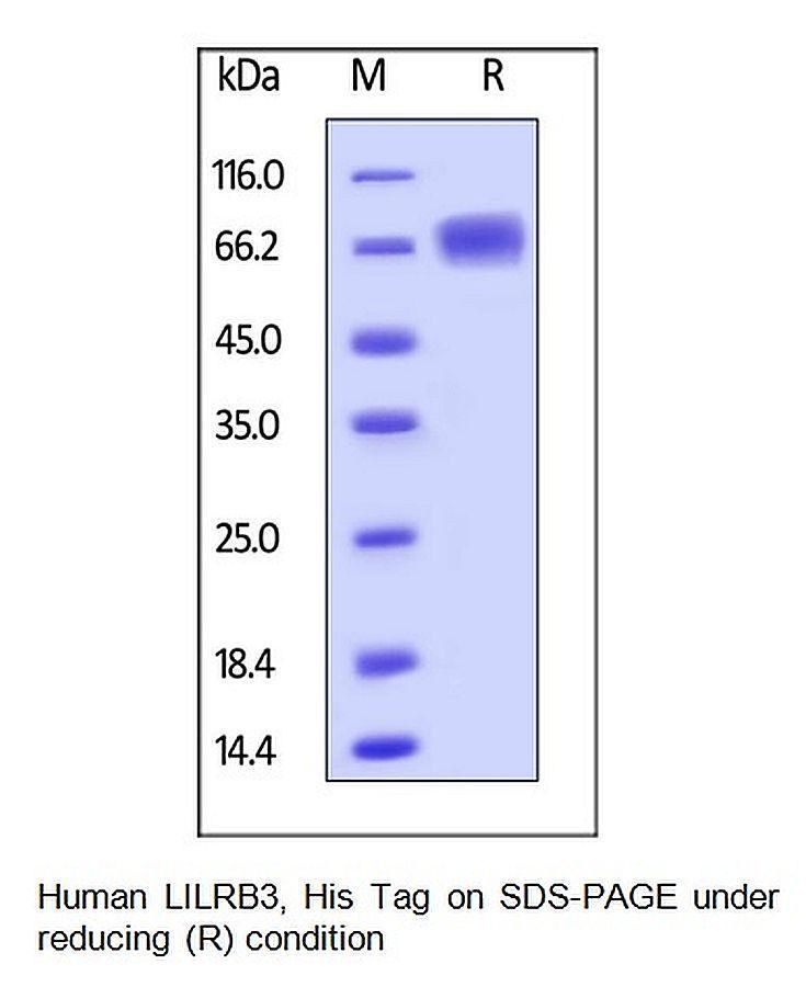 CellExp* LILRB3 / CD85a / ILT5 Human recombinant 50 ug^ CellExp* LILRB3 / CD85a / ILT5, Human recombinant, Source: HEK293 cells, Molecular Weight: 48 kDa, synonyms: LILRB3, CD85a, ILT5, Physical Form: Lyophilized from 0.22 um filtered solution in PBS, pH7.4, Appearance: Lyophilized, size: 50 ug