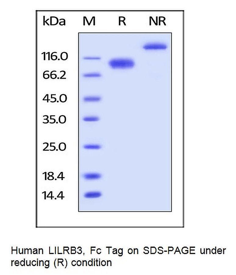 CellExp* LILRB3 / CD85a / ILT5, Fc Tag Human recombinant 10 ug^ CellExp*LILRB3 / CD85a / ILT5, Fc Tag, Human recombinant, Source: HEK293 cells, Purity: > 95%, Molecular Weight: 72.8 kDa, synonyms: LILRB3, CD85a, ILT5, Endotoxin Level: < 1.0 EU per/ug, Appearance: Lyophilized, size: 10 ug